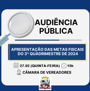 O objetivo das audiências é demonstrar e avaliar o cumprimento, pelo Poder Executivo Municipal, das Metas Fiscais e das Metas Fiscais da Saúde no 3º quadrimestre de 2024, em conformidade com as obrigações estabelecidas no § 4º do Art. 9º da Lei Complementar nº 101 (Lei de Responsabilidade Fiscal) e na Lei Complementar nº 141, de 13 de janeiro de 2012.